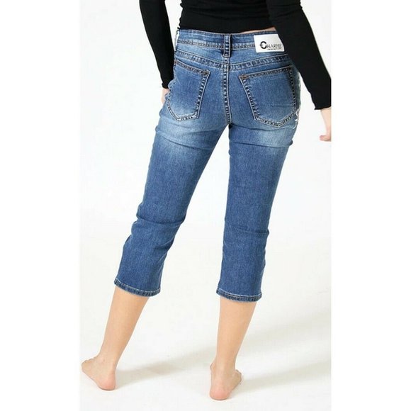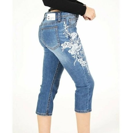 The Charme women's capri jean in Easy Fit shows off your best shape by featuring a higher rise. The mid-rise creates a form-flattering fit for every curve. The jean is detailed with a white floral embroidered design, natural hand-sanding, and whiskering. The denim fabric has the perfect amount of stretch and great holding power.