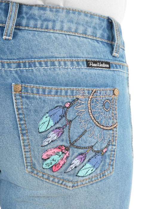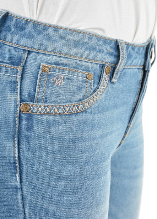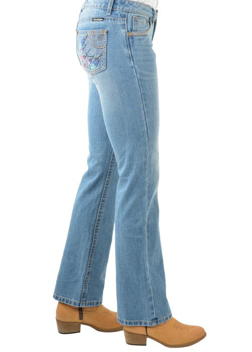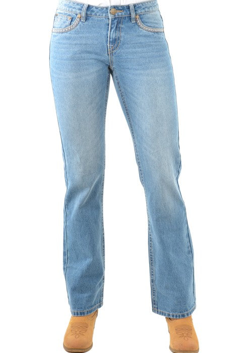 34 Inch leg - boot cut, stretch for comfort, mid rise, logo shank button, brass textured rivets, woven logo label at back yoke, feature embroidery with metallic thread on back pockets and front scoop pockets, logo embroidery on coin pocket, contrast all over topstitch