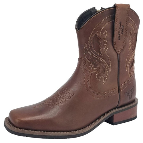 Leather upper and 7.5” leather shaft, cut out pattern with leather underlay, wide square toe, taped interior seams for added comfort, synthetic moisture-wicking lining, removable moisture-wicking cupped memory foam innersole, durable rubber outsole, side zip for easy access, 4cm (1 1/2”) block resin heel