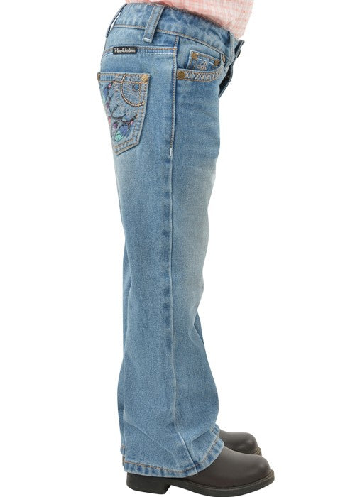 Boot cut, stretch for comfort, mid rise, adjustable elastic waistband on all sizes, logo shank button, brass textured rivets, woven logo label at back yoke, feature embroidery on back and front scoop pockets, logo embroidery on front coin pocket, contrast all over topstitch