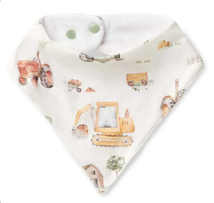 The Diggers & Tractors Organic Bandana Dribble Bibs, feature the exclusive print on one side and luxurious organic terry cotton on the back. This dribble bib features two easy snap buttons to adjust the fit, and are machine washable. The bibs make great gifts.