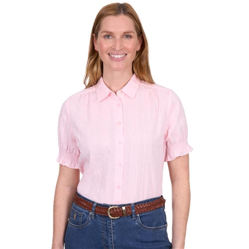 Textured light weight cotton, shell shank button at front neck opening, elasticated shirred sleeve hems with soft gathers, soft gathers at front, and back yokes, TC embroidery on side hem