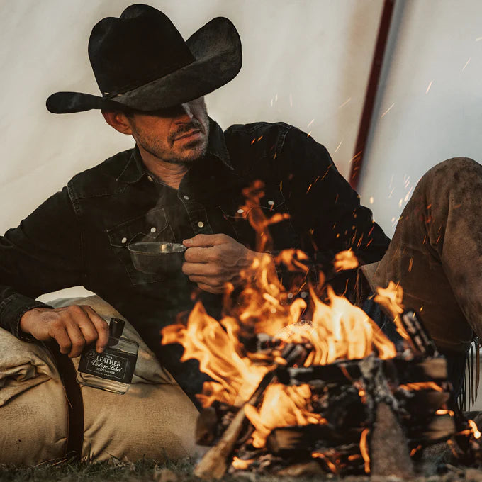 Leather Vintage Label Deep Leather captures the spirit of the West, where rugged landscapes meet starlit skies. Inspired by soulful conversations around the campfire, this warm cologne combines unique notes of smoky leather, crystal salt and black amber.