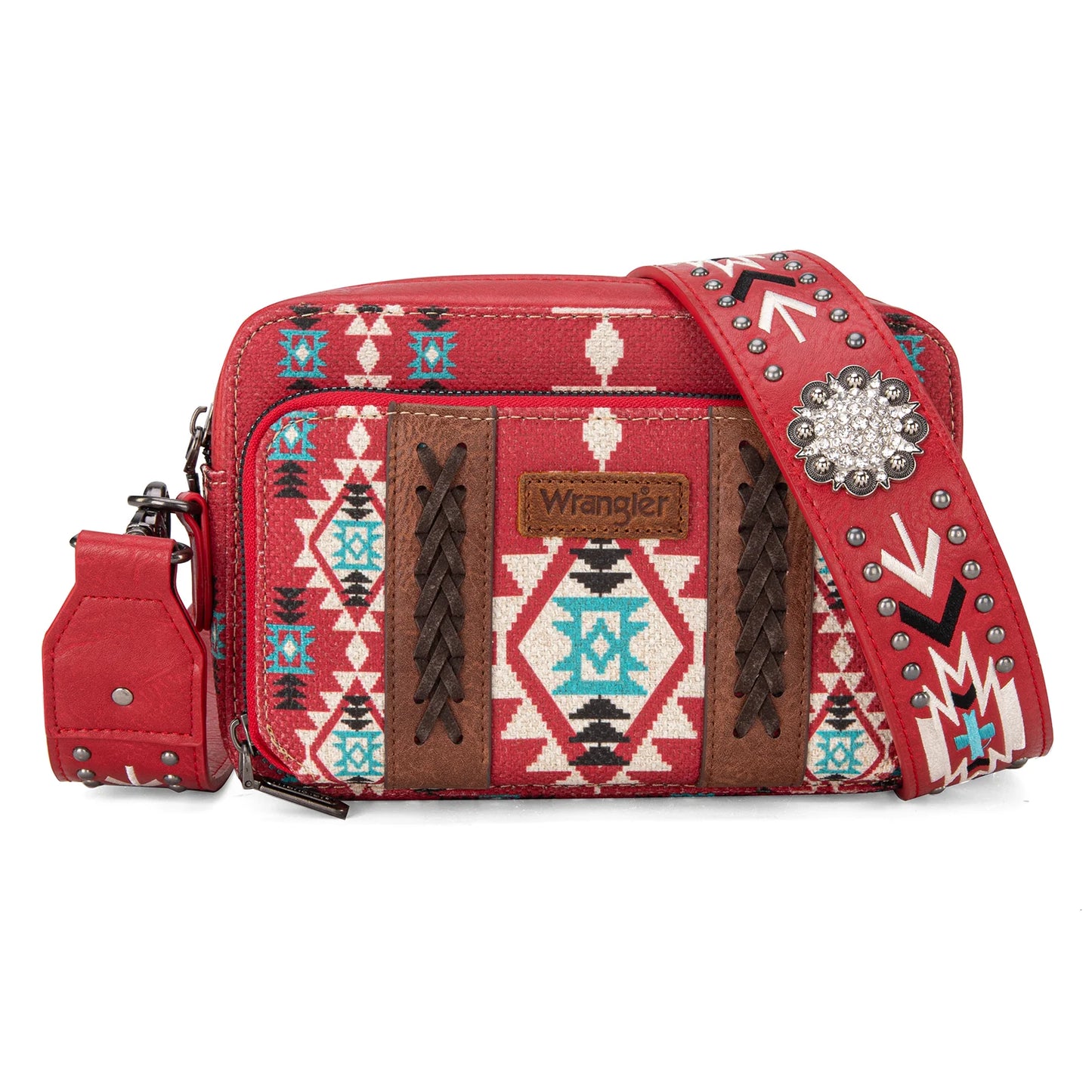 Wrangler Aztec Printed Crossbody Purse With Wallet Compartment - Red