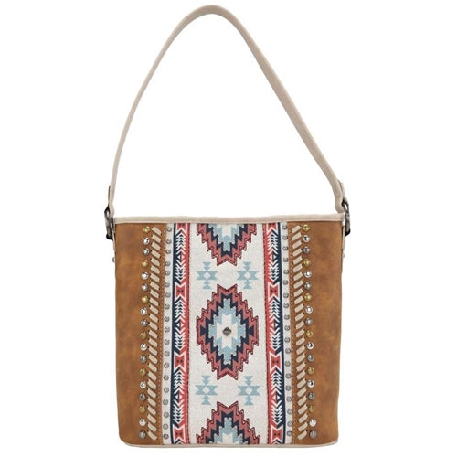 Indulge in functional fashion with the Wrangler Carmen Bag. Featuring internal zip and slip pockets, whip stitch and dome detailing, and an Aztec printed canvas panel, this bag offers both style and convenience. Complete with a shoulder strap and matching wallet, it's the perfect accessory for any occasion.