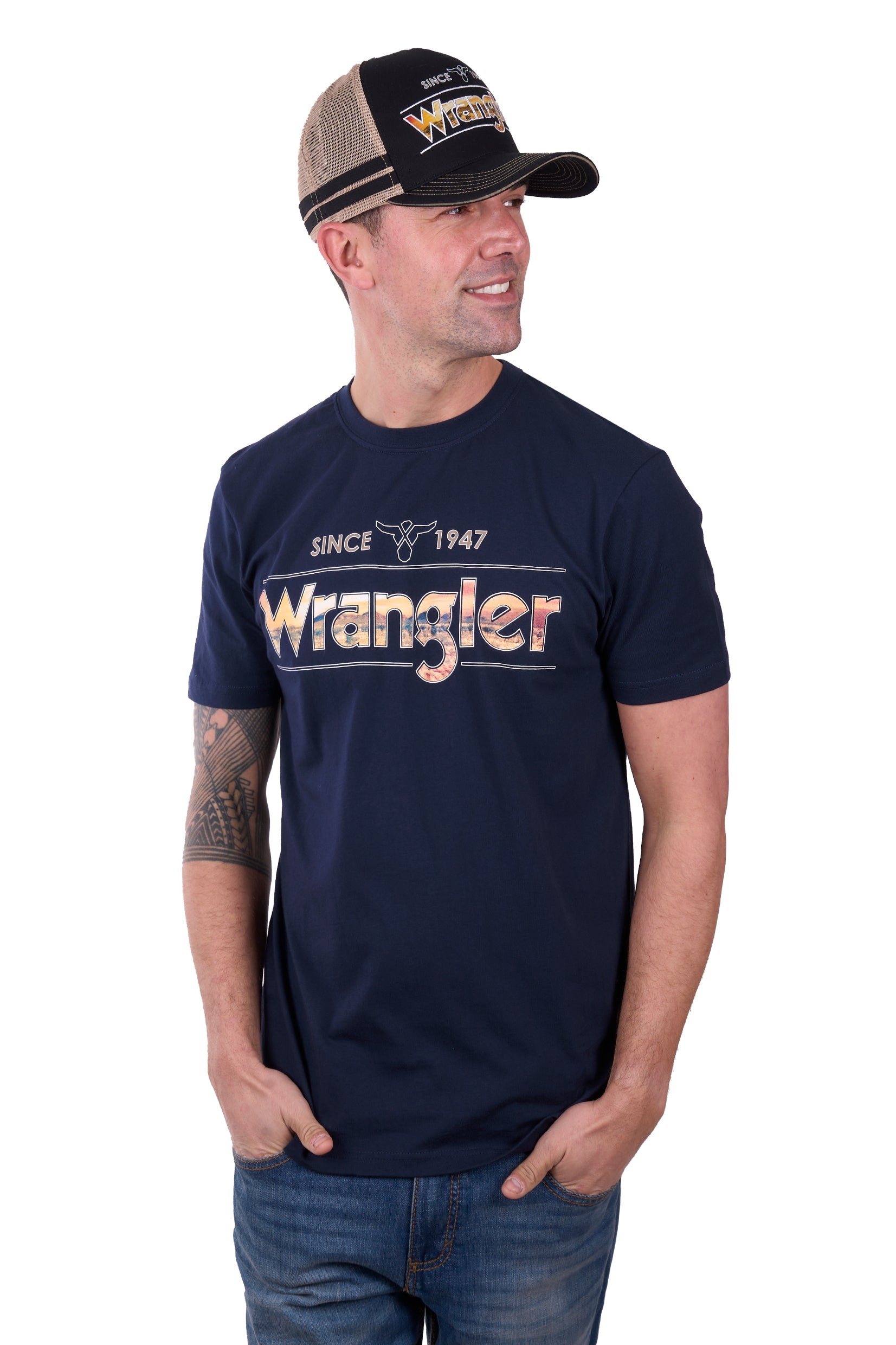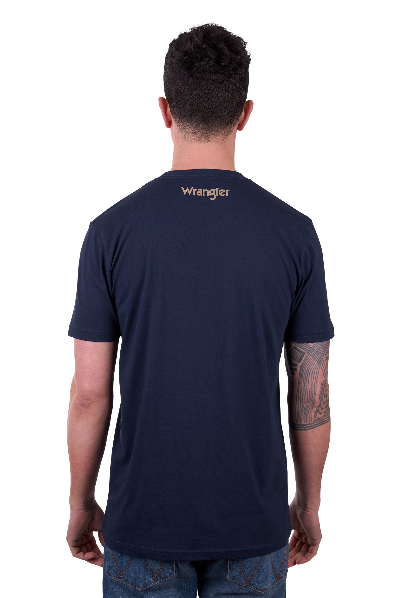 Classic tee shape, rib neck band, Wrangler® iconic logo hem label
