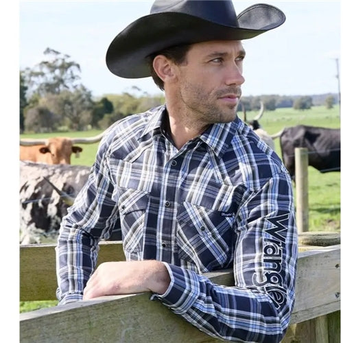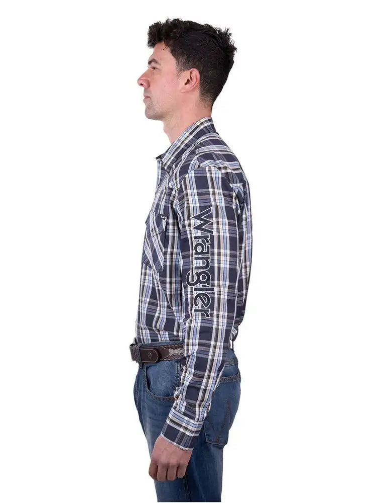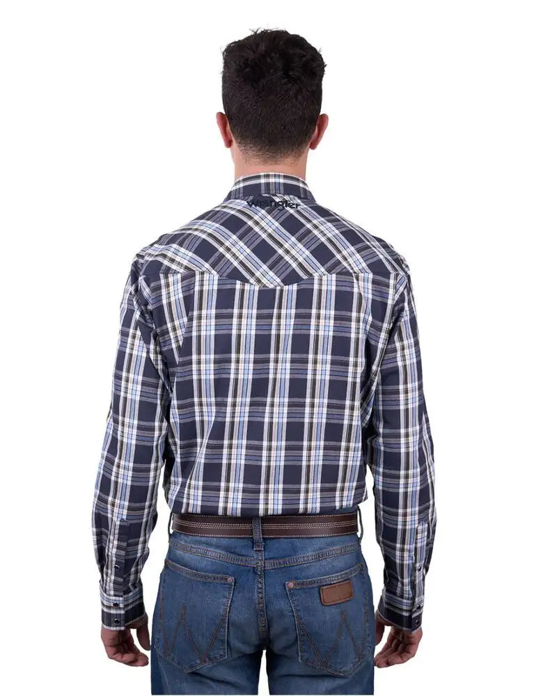 A classic western long sleeve shirt with snap closure, western chest pockets (one with pen holder), western front and back yokes, Wrangler® iconic logo back neck embroidery, and Wrangler® iconic logo sleeve embroidery.