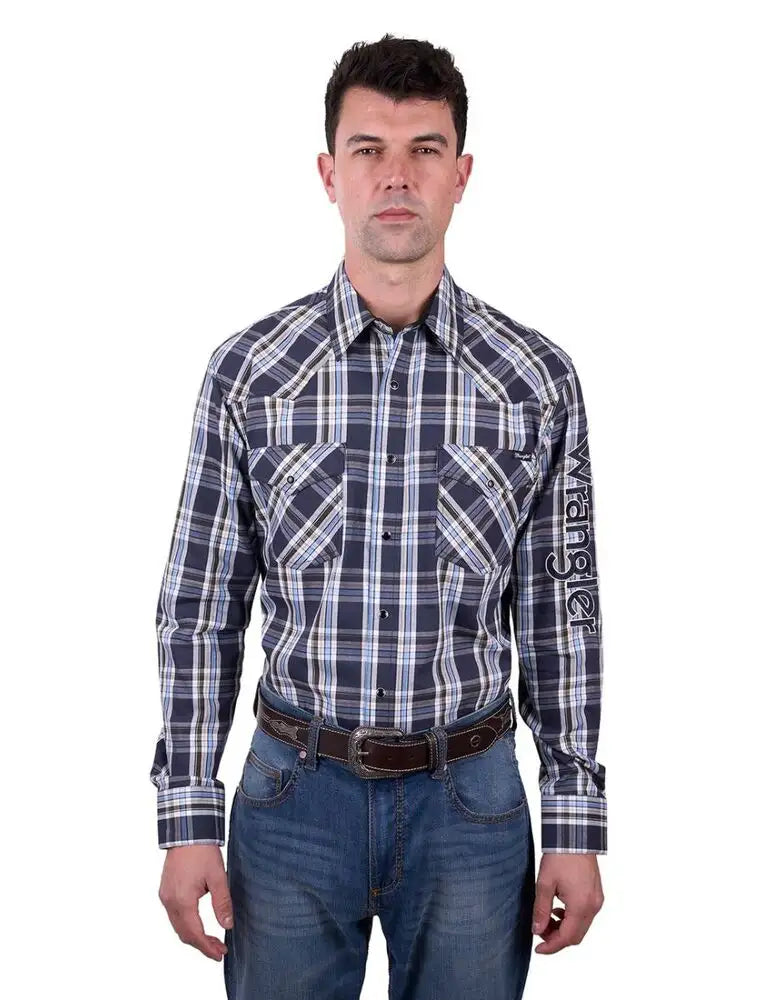 Classic western long sleeve shirt, Snap closure, Western chest pockets, one with pen holder, Western front and back yokes, Contrast trim on inside collar stand and sleeve cuffs, Wrangler® iconic logo back neck embroidery, Wrangler® iconic logo sleeve em