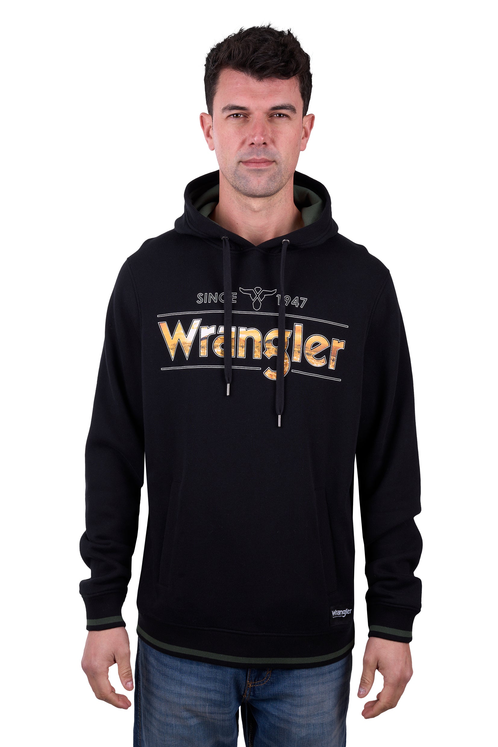 Heavyweight brushed fleece pullover, contrast hood lining, hood with drawcord closure and metal trims, front welt pockets, rib trim (pockets, hem, cuffs and side panels), contrast stripe tipping on rib hem and cuffs, Wrangler® iconic logo hem label