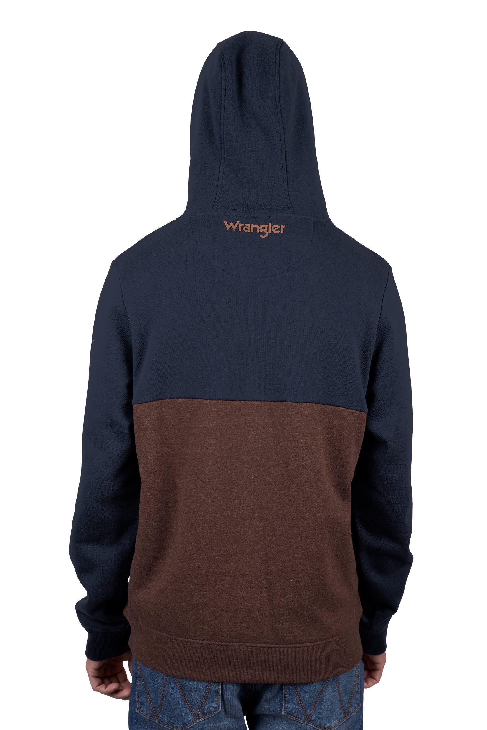 Heavyweight brushed fleece pullover, cut'n'sew contrast panelling, contrast hood lining, hood with drawcord closure and metal trims, front kanga patch pocket, rib trim (pocket opening, hem, cuffs and side panels), Wrangler® iconic logo pocket label