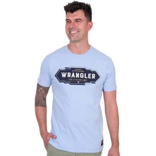 Classic tee shape, rib neck band, Wrangler® iconic logo hem label.