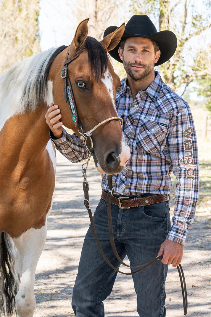 Classic western long sleeve shirt, snap closure, western chest pockets (one with pen holder), western front and back yokes, contrast trim on inside collar stand, Wrangler® iconic logo sleeve embroidery.